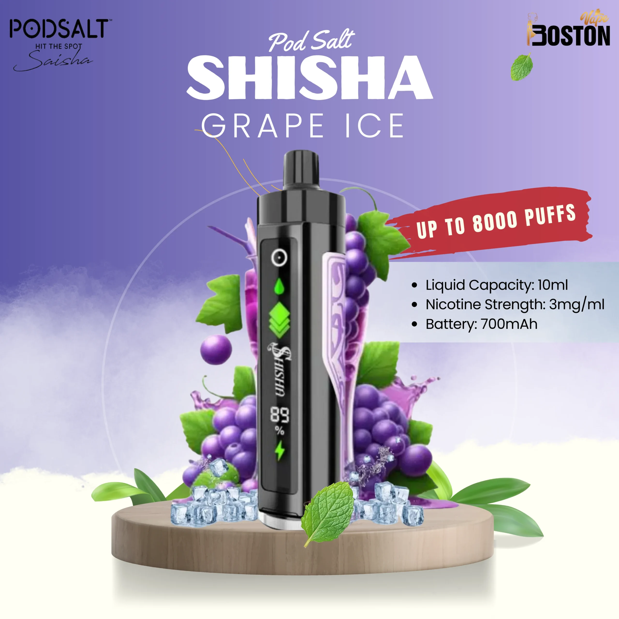 Enjoy the bold and icy taste of Pod Salt Shisha 8k Puffs – Grape Ice. It delivers a rich, sweet grape flavor with a cool finish that feels smooth and refreshing. Each puff stays consistent, giving you a clean and satisfying hit every time. With up to 8,000 puffs, it’s designed for long use without any charging or refilling. The device is compact, easy to carry and perfect for daily use or on the go. If you enjoy a classic grape taste with a chilled twist, this disposable is a solid choice.